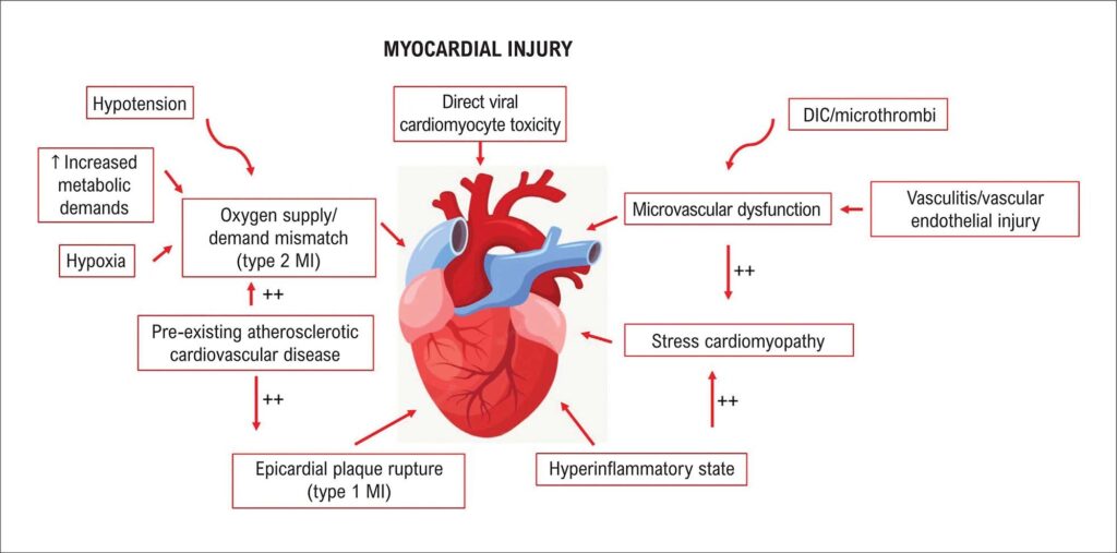 Epidemiological data from China have suggested that cardiac injury may occur in 19% to 28% of hospitalized patients with COVID-19. Several factors seem to contribute to myocardial damage, and potential mechanisms of injury include: hypoxic injury, stress cardiomyopathy, ischemic lesion caused by cardiac microvascular dysfunction, small vessel cardiac vasculitis, endotheliitis, epicardial coronary artery disease, right heart distention (acute cor pulmonale with pulmonary embolism), myocarditis, systemic inflammatory response syndrome (cytokine storm), and others , ().