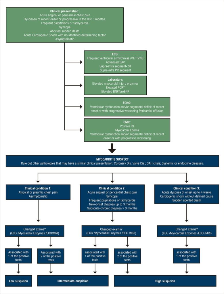 The criterion for the diagnostic confirmation of myocarditis defined by the 2013 European and Brazilian Myocarditis Guidelines is the identification of myocardial inflammation by endomyocardial biopsy (EMB)., This diagnostic criterion, used solely without the option of classifying clinical suspicion, does not mirror clinical practice in the real world, where only a minority of patients in specialized centers are referred for diagnostic investigation through EMB with diagnostic confirmation or exclusion, and most have the diagnosis of clinical suspicion of myocarditis. As an innovation, the 2022 Brazilian Guideline introduces an organizational chart to establish the degrees of suspected diagnosis of myocarditis, which correspond to clinical practice in the real world, where most patients will have a diagnosis of suspected myocarditis rather than confirmation. This organization chart is based on clinical history, myocardial injury biomarkers, electrocardiogram, echocardiogram, and cardiac magnetic resonance, to establish a diagnostic suspicion of myocarditis (), which will define different approaches regarding follow-up, treatment, and the need for EMB. Patients with low suspicion of myocarditis have a favorable prognosis with a low risk of developing ventricular dysfunction or cardiovascular mortality, and clinical follow-up is indicated without the need for cardioprotective drugs. Cardioprotective drugs and clinical and ventricular function follow-up by echocardiogram and magnetic resonance imaging are indicated for patients with an intermediate degree of suspicion of miocarditis. Patients with high diagnostic suspicion or with intermediate suspicion with worsening clinical or ventricular function have a worse long-term prognosis, with lower survival, being indicated in this group the EMB for the investigation of the inflammatory activity and the etiological agent to evaluate treatment with immunosuppressants and therapy directed towards the identified etiological factor (). With the diagnostic suspicion classification, the new Guideline approaches clinical practice, standardizing the clinical management of most patients with suspected myocarditis and reserving the indication of EMB for those with greater potential for clinical benefit from immunosuppressive therapy.