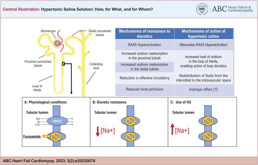 The administration of hypertonic saline (HS) in decompensated heart failure (HF) seems counterintuitive, given the concept that sodium is universally harmful for these patients. However, increasingly, strict sodium restrictions have been questioned due to the lack of proven benefits. On the other hand, we know that in acute HF complicated with diuretic resistance, there is hyperactivation of the renin-angiotensin-aldosterone system (RAAS), resulting in a state of excessive increase in renal avidity for sodium, hindering the action of loop diuretics. In this sense, HS would have the potential to attenuate the hyperactivation of RAAS and provide a supply of sodium to the renal tubules, enabling the action of loop diuretics. Several studies have consistently demonstrated that the association of HS with loop diuretics results in greater diuresis, weight loss, and possibly improved renal function. Therefore, despite being underused, we believe that HS is an effective, low-cost, and widely available strategy whose mechanism of action addresses one of the central points in the pathophysiology of diuretic resistance.