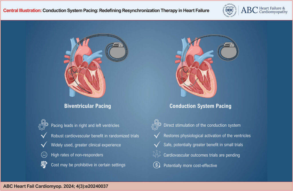 Cardiac resynchronization therapy is a foundational treatment in patients with heart failure with reduced ejection fraction (HFrEF) and left bundle branch block (LBBB). Although resynchronization has traditionally been performed via biventricular pacing, this approach may be limited by a high rate of non-responders and elevated cost. Conduction system pacing, sometimes referred to as “physiologic” pacing, involves direct stimulation of the heart’s intrinsic conduction pathways and has emerged as a promising alternative. Large intercontinental registries have supported the safety of conduction system pacing in different settings, with high procedural success and low complication rates that are comparable to biventricular pacing. Moreover, in small, randomized trials, conduction system pacing has led to similar or greater improvements in left ventricular ejection fraction and QRS duration versus biventricular pacing, potentially at a lower cost. Ongoing cardiovascular outcomes trials are expected to conclusively determine the role of conduction system pacing in the management of patients with HFrEF and LBBB.