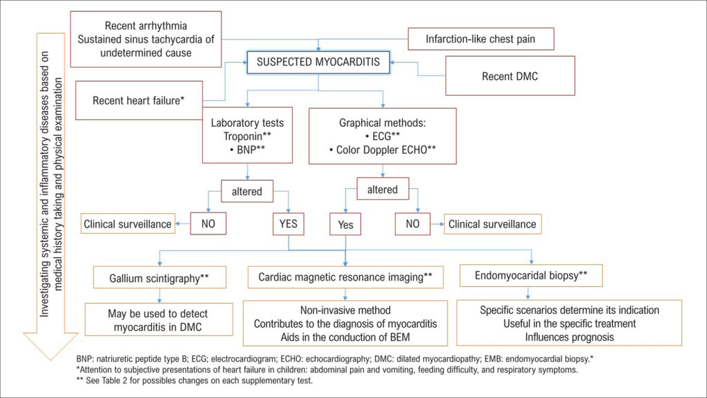Myocarditis in children and adolescents is an inflammatory myocardial disease with a heterogeneous presentation ranging from oligosymptomatic, with no impaired ejection fraction to catastrophic clinical presentation with cardiogenic shock (fulminant myocarditis) or sudden death. Thus, this condition remains a major challenge from the diagnostic and therapeutic points of view. Despite the different etiologies listed, the most frequent form may be related to viral diseases, and new forms of myocarditis, such allergic ones (eosinophilic and use of medications, particularly cancer immunotherapy), have been currently described. Increasing the rate of suspicion is crucial. Measurement of serum levels of troponin and N-terminal B-type natriuretic peptide, as well as the use of advanced methods of cardiac imaging, such as strain echocardiogram, positron emission tomography, and cardiac magnetic resonance, are integral part of multimodal assessment in suspected patients. Although endomyocardial biopsy remains is still the gold standard for disease diagnosis, currently it tends to be performed in specific situations, such as fulminant clinical presentation and chronic or recurrent myocarditis. The management of this condition includes general supportive care, treatment of heart failure, control of arrhythmias when present, assessment of mechanical support and cardiac transplantation. Treatments based on immunosuppression and immunotherapy are still controversial. In this article, we propose a broad review of diagnostic and treatment methods, as well as the different etiologies in the pediatric population.