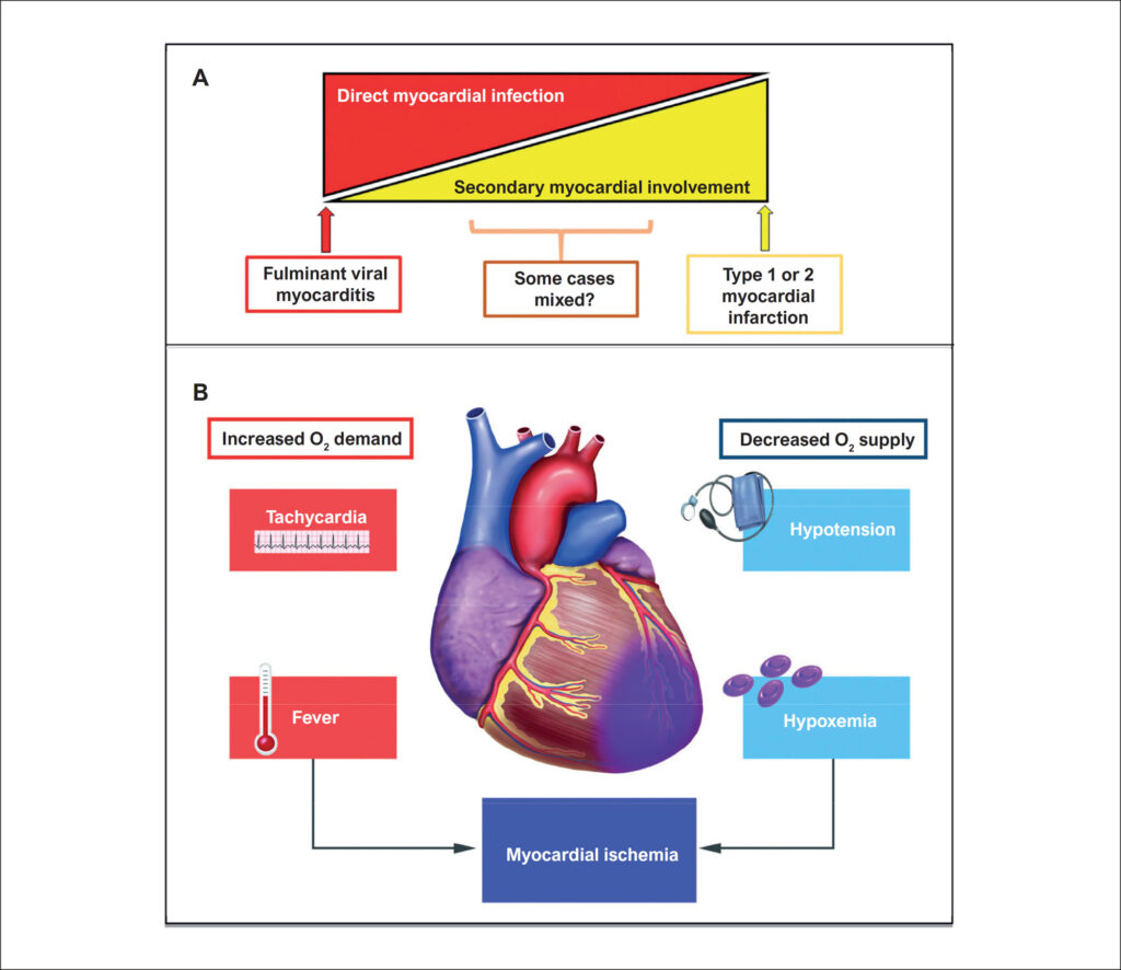 The pathophysiology of SARS-CoV-2-induced myocardial injury remains a topic of active research. COVID-19 can unfavorably affect the balance between myocardial oxygen supply and demand, as with other overwhelming viral or bacterial infections (). Fever, metabolic stress, sympathetic activation, and tachycardia increase the energy expenditure and oxygen consumption of the myocardium., This imbalance can provoke type 2 (or “demand” type) myocardial infarction. Hypoxia from respiratory impairment can favor the production of reactive oxygen species and oxidative stress, acidosis, mitochondrial damage, and cell death.,, Other mechanisms of myocardial injury during COVID-19 include ischemia from microvascular thrombi and toxic levels of cytokines. Cardiac damage due to direct SARS-CoV-2 infection of cardiac myocytes appears uncommon.– Indeed, the pericytes, smooth-muscle like cells that surround microvessels, express high levels of the receptor for SARS-CoV-2, angiotensin converting enzyme 2 (ACE2), while cardiac myocytes themselves have few, if any, of these portals of entry used by the virus.