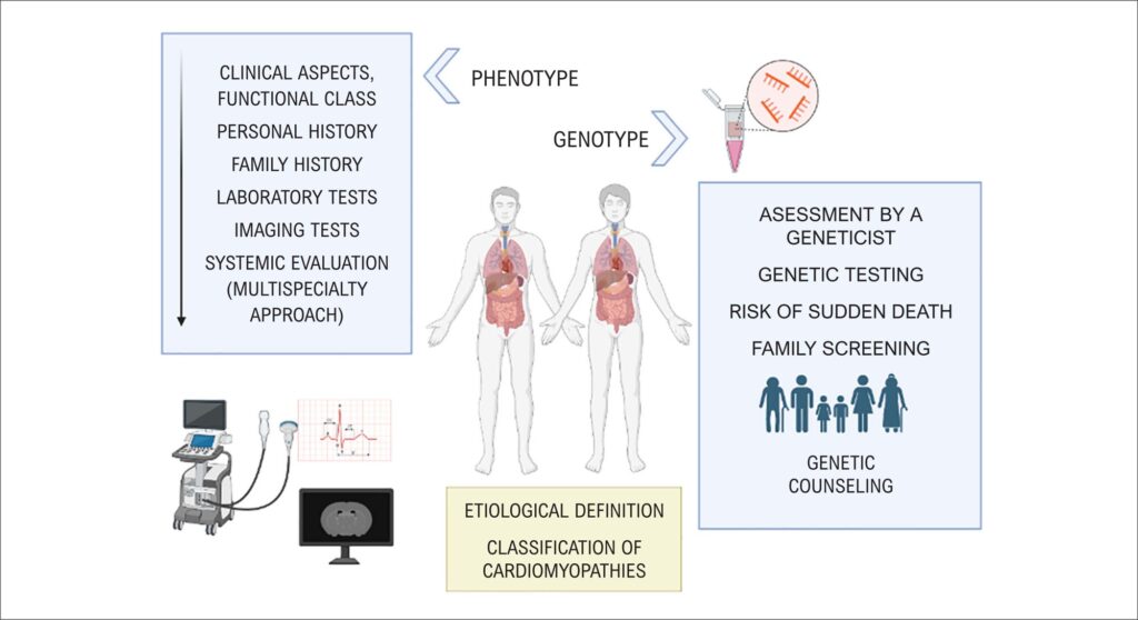 Cardiomyopathies (CMPs) are a group of diseases with multiple etiologies and heterogeneous phenotypes, ranging from microscopic changes in cardiomyocytes in asymptomatic patients to cases of fulminant heart failure with fluid retention, and perfusion and heart rhythm changes. A CMP was initially defined as a heart muscle disease caused by genetic defects, myocyte injury or myocardial infiltration, and characterized by structural and functional abnormalities in the absence of congenital disease, valvular disease or hypertension. The initial approach of patients with CMP consists of clinical evaluation and complementary imaging techniques and genetic testing, in search of diagnostic evidence and the need for specific tests ().,