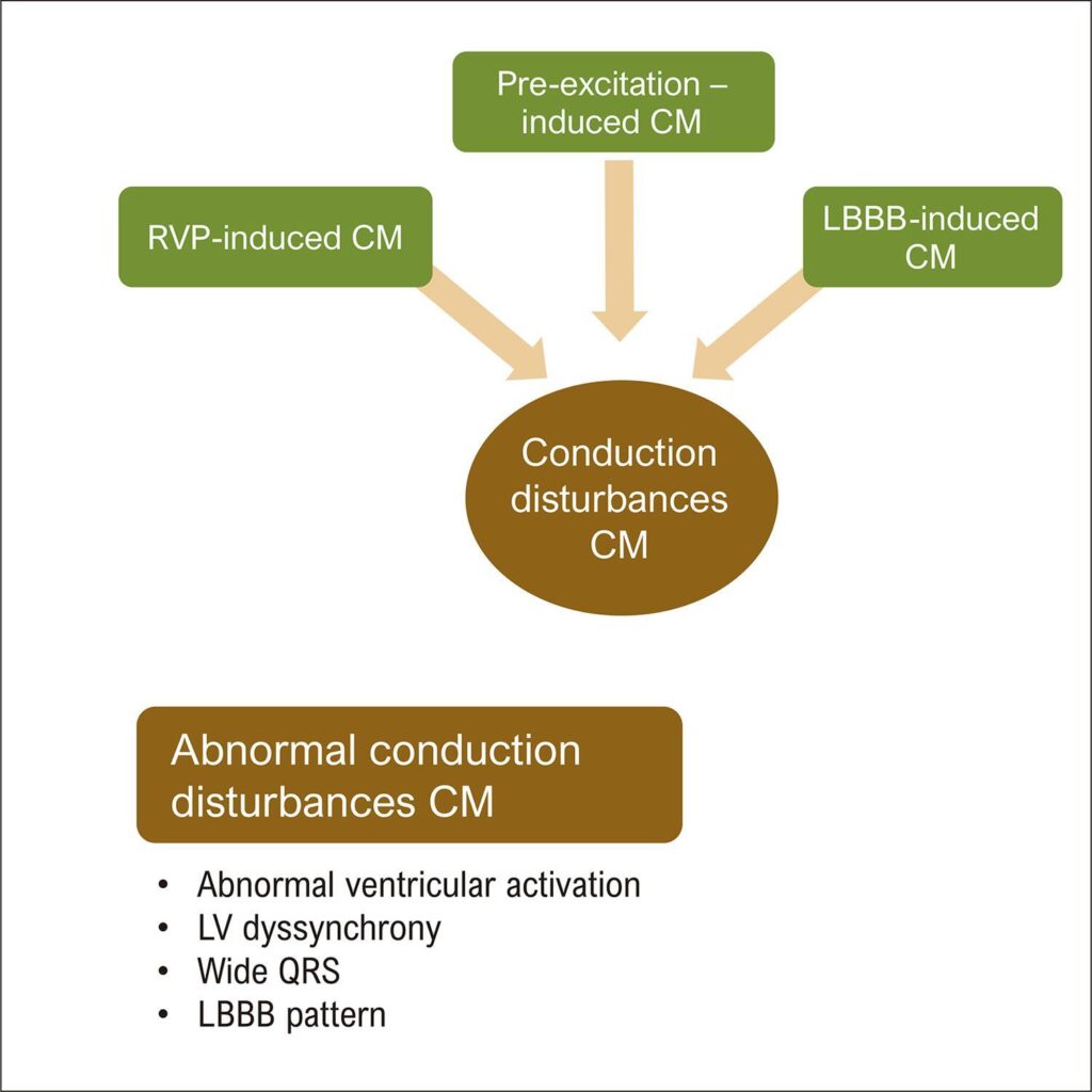 Recently, pre-excitation syndromes, left bundle branch block (LBBB), and right ventricular pacing have been recognized as causes of cardiomyopathies (CMs). They all have abnormal ventricular activation, that results in what is known as left ventricular (LV) dyssynchrony. These three entities show a common feature of wide QRS and LBBB pattern on the electrocardiogram. The term abnormal conduction-induced CM was, then, proposed. Appropriate diagnosis and treatment of these CMs will possibly improve LV ejection fraction, LV functional capacity and reduce morbidity and mortality. In this article we will briefly review these three clinical conditions, aiming to help clinicians to recognize them, manage and refer patients at risk.