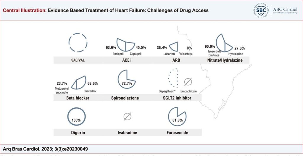 Heart failure (HF) is a complex clinical syndrome with high prevalence, significant morbi-mortality and is the leading cause of hospital admissions of Brazilian patients over 65 years of age. Drug therapy plays a key role in the care of HF patients, aimed to control symptoms, improve functional classification, reduce hospital readmissions and HF-related mortality rates. Despite the evidence of drug therapy proven benefits in HF, their access through the Unified Health System (Sistema Único de Saúde, SUS) remains unexplored. The present study aims to analyze the dynamics of access to HF therapy, based on the list of drugs made available by the SUS through a descriptive and documental methodology. Data were collected from the Municipal Lists of Essential Medicines in a metropolitan region in southern Brazil. Municipalities with a population over 80,000 inhabitants were included, and the respective lists of available drugs were reachable electronically by the health departments themselves. The results showed a partial access to HF treatment via the SUS, especially spironolactone and furosemide, present in 72.7% and 81.8% of the municipalities, respectively. Although drug treatment for HF has proven a high level of evidence, access via SUS represents a challenge to overcome in the continuum of care of patients with heart failure in Brazil