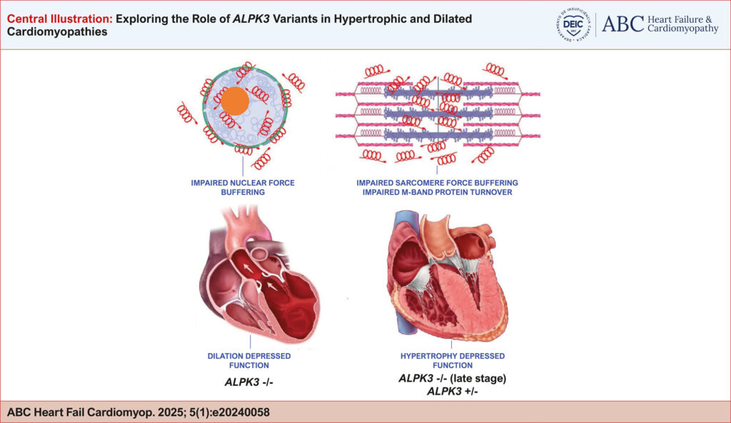 Alpha-protein kinase 3 (ALPK3) variants, particularly truncating mutations (ALPK3tv), have been associated with both hypertrophic cardiomyopathy (HCM) and dilated cardiomyopathy (DCM), contributing to phenotypic variability and severe clinical outcomes. HCM is characterized by left ventricular hypertrophy (LVH) not attributable to other causes and is a common genetic disorder, often linked to pathogenic variants in sarcomeric genes. However, clinical genetic testing fails to identify a causative mutation in approximately 40% of the cases, suggesting the involvement of non-sarcomeric genes such as ALPK3. Recent studies have revealed that biallelic ALPK3tv is associated with severe early-onset cardiomyopathy. Patients may exhibit a clinical progression from DCM in infancy to HCM, with impaired systolic function in later life. The HCM phenotype in these individuals is often characterized by extensive myocardial fibrosis, apical or concentric patterns of left ventricular hypertrophy, and a low prevalence of left ventricular outflow tract obstruction. ALPK3tv carriers are also at risk for progressive myocardial dysfunction, heart failure, and, in some cases, sudden cardiac death. The molecular mechanisms underlying ALPK3-related cardiomyopathy involve the disruption of key structural and regulatory proteins, such as myomesins, which are essential for sarcomere integrity and cardiomyocyte force buffering. The discovery of ALPK3 variants in underrepresented populations further highlights the importance of genetic research in diverse cohorts. Understanding the clinical and molecular consequences of ALPK3 variants could lead to more precise diagnostic and therapeutic approaches for cardiomyopathies associated with this gene.