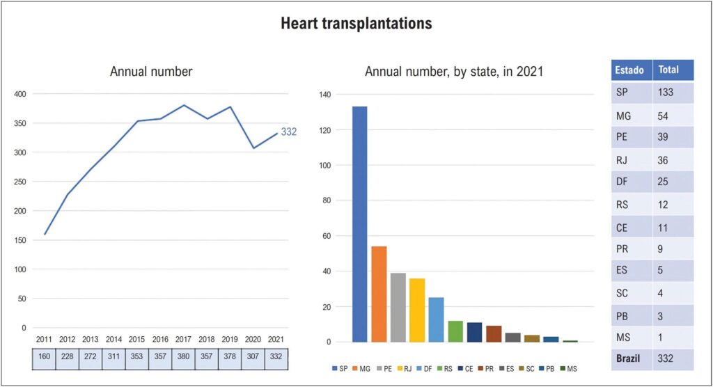 Patients with heart failure (HF) refractory to guideline-directed medical therapy should be considered for advanced therapies, such as heart transplantation (HT), ventricular assist devices, or even palliative care in cases where these procedures are contraindicated or unavailable. In this scenario, HT is the standard treatment. Brazil has shown a significant increase in the number of transplants in recent years, but this number is still not compatible with the number of patients who require this treatment. Furthermore, most transplants are concentrated in few regions and centers (). The following factors limit the growth in the number of HTs performed in Brazil: few qualified transplant centers, inadequate care for donors, critical condition of recipients, and limited access to medium- and long-term circulatory assist devices. Transplant centers aim to optimize recipients’ clinical condition, to create logistical conditions to increase the efficiency of organ procurement, and to train professionals, thus generating a positive impact on the number and the outcomes of transplants. The organization of a transplant center with a multidisciplinary team is essential to improve not only the care provided to the recipient, but also the entire process involved in HT, including organ procurement. Transplant centers are composed of a broad multidisciplinary team responsible for evaluating and optimizing recipients’ clinical conditions, evaluation of donors, operationalization of procurement, perioperative care, and long-term care of HT recipients (). Teams are usually composed of the following: clinical cardiologists, cardiovascular surgeons dedicated to HT, nurses, biomedical doctors, intensive care specialists, infectious disease specialists, pathologists, immunologists, and others.