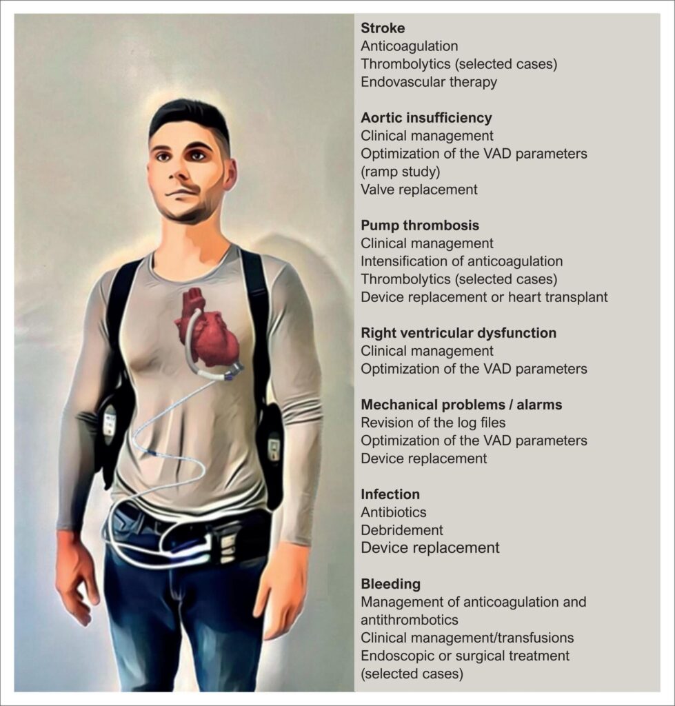 Advanced heart failure (HF) is associated with reduced quality of life and high hospitalization and mortality rates. Ventricular assist devices (VADs) promote an increase in cardiac output, and consequently improvements in body functions, functional capacity and patient survival. However, the use of VAD may be associated with complications and require systematic and specialized care. Ischemic and hemorrhagic stroke is among the most feared complications and its occurrence is related to thrombus formation in the pump. The connection between the driveline and the external power source is a potential source of infection that may extend to the mediastinum. Management of bleeding caused by anticoagulation therapy may be challenging, since discontinuation of the treatment may lead to thrombus formation. Aortic insufficiency and right ventricular dysfunction may occur, particularly in prolonged periods of support, requiring optimization of VAD parameters and clinical management. Although uncommon, mechanical failure of the VAD may occur and require replacement of the pump or even heart transplant. Thus, identification and management of the main complications of VAD in patients with advanced HF is needed, so that strategies for prevention and rigorous clinical follow-up can be implemented. This review aims to summarize the main adverse events in patients with long-term VAD.