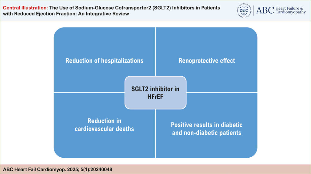 Heart failure (HF) is characterized as a clinical syndrome comprised of different etiologies. HF can be classified according to the left ventricular ejection fraction (LVEF) in heart failure with preserved ejection fraction (HFpEF) and heart failure with reduced ejection fraction (HFrEF). Studies have shown that sodium-glucose cotransporter2 (SGLT2) inhibitors can collaborate in the treatment of HF. To conduct a bibliographic survey in the form of an integrative qualitative review on the use of SGLT2 inhibitors in the treatment of heart failure. This study was carried out through the elaboration of an integrative literature review. Articles published in the last five years were selected from the PubMed, SciELO, LILACS, and Cochrane Library databases, using the following descriptors: “Diabetes Mellitus”, “Heart Failure”, “Heart Failure with Reduced Ejection Fraction” and “Sodium-Glucose Transporter 2 Inhibitors” A total of 1,504 articles, published in the PubMed, SciELO, Cochrane Library, and LILACS databases, were found. After analysis, in accordance with the inclusion and exclusion criteria; reading of the abstracts or full text; and exclusion of duplicate articles, 17 studies were selected, In the past five years, there has been a lack of conclusive studies on the use of SGLT2 inhibitors. Studies, such as DAPA-HF, have shown that dapagliflozin reduces hospitalizations and cardiovascular deaths in patients with HF, regardless of their glycemic status. Recent guidelines have already incorporated SGLT2 inhibitors for the treatment of HFrEF due to strong scientific evidence.