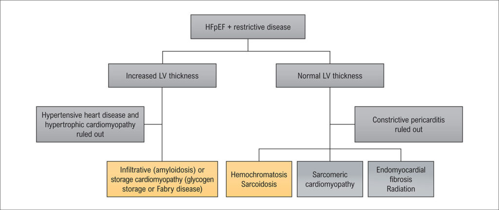 Restrictive cardiomyopathies are diseases of the heart muscle that can arise due to various etiologies, including genetic abnormalities, infiltrative diseases, and storage diseases. From a pathophysiological point of view, they have in common the fact that they cause an increase in ventricular rigidity. Their real prevalence is unknown, but they are considered the least common form of cardiomyopathies. The infiltrative and storage diseases that can cause HFpEF include diseases with very different characteristics and evolution, such as amyloidosis, sarcoidosis, hemochromatosis, lysosomal disorders, and glycogen storage disorders.