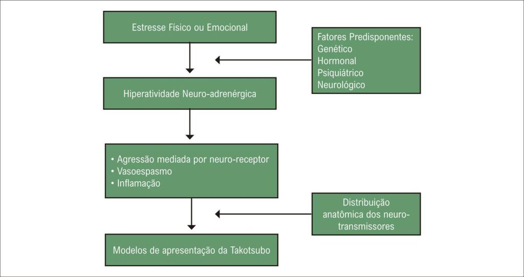 A Takotsubo Cardiomiopatia (TC) também conhecida como cardiomiopatia induzida por estresse, é uma síndrome reversível que se apresenta usualmente como síndrome coronariana aguda, especialmente nas mulheres na fase pós-menopausa. A fisiopatologia envolve múltiplos fatores, incluindo vasoespasmo coronariano, disfunção da microcirculação, agressão catecolaminérgica e hiperatividade simpática. O diagnóstico da apresentação clássica é a presença de alteração segmentar em forma de balonamento ou discinesia da região antero-septo-apical do ventrículo esquerdo, associada a hiperdinamia dos segmentos basais, na ausência de doença coronariana obstrutiva que justifique esta alteração na contração. Inicialmente se acreditava que a TC era uma condição autolimitada de bom prognóstico, não obstante, atualmente é reconhecida como uma patologia com alto índice de complicações e uma morbidade e mortalidade elevadas a curto e longo prazo. A despeito de que a primeira descrição tem sido há mais de 30 anos, em 1990 por Sato, a etiologia e fisiopatologia ainda permanecem não plenamente definidas e ainda não temos uma diretriz internacional com a normatização do diagnóstico e tratamento.