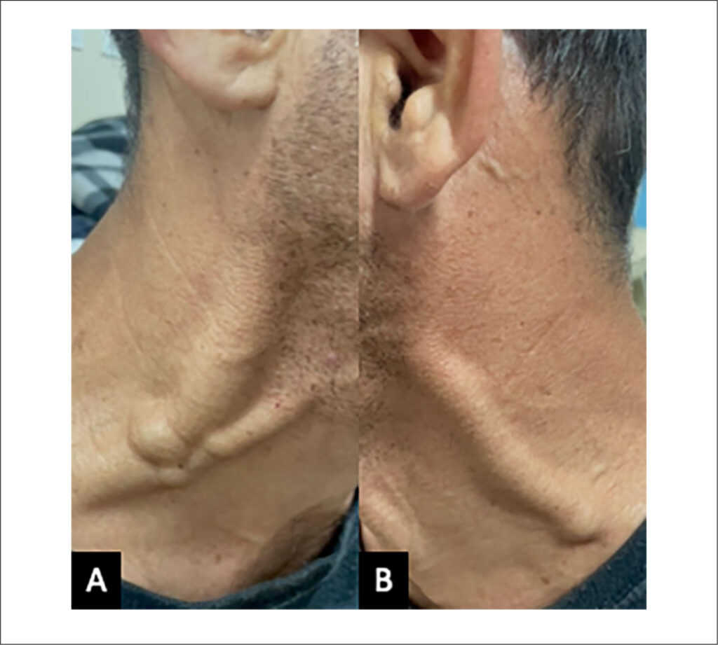 Ao exame físico, pressão arterial 129/81 mmHg, frequência cardíaca de 88 batimentos por minuto, frequência respiratória de 20 incursões por minuto, saturação de oxigênio 98%. Apresentava importante turgência jugular bilateral (), ritmo cardíaco irregular e clique mesossistólico em bordo esternal esquerdo baixo, ausculta pulmonar com murmúrios vesiculares presentes bilateralmente e sem ruídos adventícios, abdome flácido, doloroso à palpação de epigástrio e hipocôndrio direito e edema em membros inferiores ++/4. Avaliação inicial demonstrou sinais de insuficiência cardíaca direita devido às alterações no exame físico.