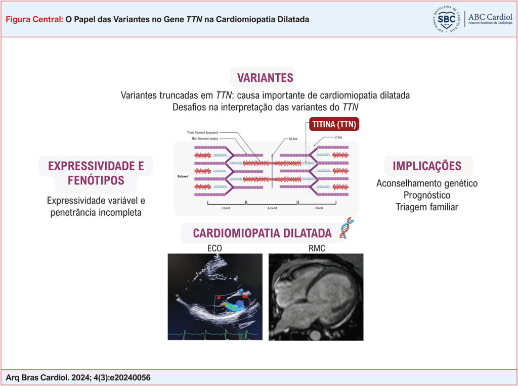 A titina, codificada pelo gene TTN, é a maior proteína humana, essencial para a manutenção da estabilidade das células musculares e regulação da contração miocárdica. As variantes truncadas do TTN (TTNtv) têm sido consideradas a causa genética mais comum de cardiomiopatia dilatada (CMD), respondendo por até 25% dos casos familiares e 18% dos casos esporádicos. Esta revisão examina a relação complexa entre as variantes no gene TTN e a CMD, destacando os desafios impostos pela penetrância incompleta e a expressividade variável. Embora as variantes truncadas, principalmente na região da banda A, estejam ligadas à CMD, nem todos os portadores apresentam sintomas clínicos, indicando a influência de fatores genéticos e ambientais adicionais. Além disso, discutimos as implicações prognósticas das variantes no gene TTN, que, apesar dos resultados clínicos semelhantes a outros casos de CMD, demonstram uma taxa maior de remodelação reverso em resposta ao tratamento da insuficiência cardíaca. Estratégias terapêuticas emergentes, que visam mecanismos moleculares subjacentes das variantes no gene TTN, incluindo inibidores de mTOR e edição genética baseada em CRISPR, oferecem possibilidades promissoras para um tratamento personalizado. Compreender os fundamentos genéticos da CMD relacionada ao TTN é crucial para melhorar o diagnóstico, o rastreamento familiar e os resultados terapêuticos, abrindo caminho para um manejo mais eficaz desse quadro complexo.