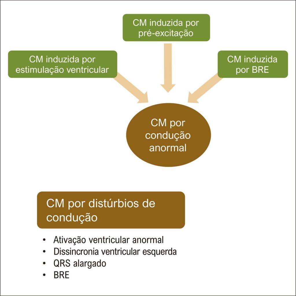 Recentemente, síndromes de pré-excitação, bloqueio de ramo esquerdo (BRE) e estimulação ventricular direita foram reconhecidos como causas de cardiomiopatias (CM). Essas condições apresentam ativação ventricular anormal, que resulta em um quadro conhecido como dissincronia do ventrículo esquerdo. Essas três entidades têm como característica comum um QRS largo e um padrão de BRE no eletrocardiograma. O termo CM induzida por condução anormal foi então proposto. O diagnóstico e o tratamento adequados dessas CMs poderão promover melhora da fração de ejeção e capacidade funcional do ventrículo esquerdo, e redução da morbimortalidade. Neste artigo, faremos uma breve revisão dessas três condições clínicas, visando auxiliar os médicos no seu reconhecimento e manejo, e no encaminhamento dos pacientes em risco.