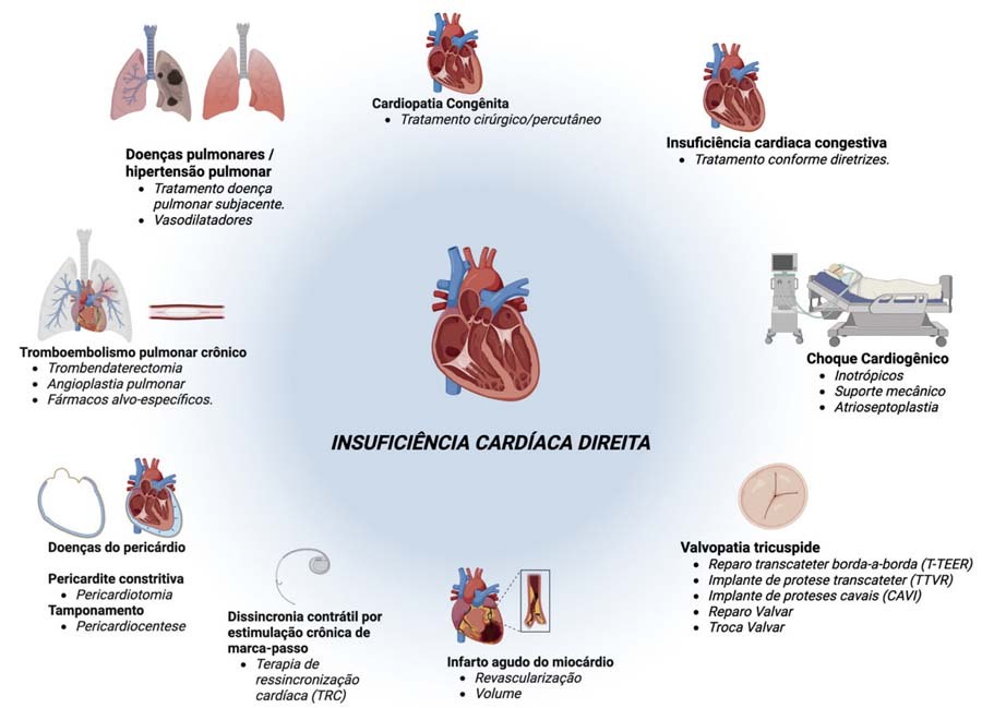 A insuficiência cardíaca direita (ICD) é uma condição grave caracterizada pela falência do ventrículo direito em gerar débito suficiente para a circulação pulmonar, resultando em congestão sistêmica e hipoperfusão. O manejo adequado da ICD é essencial para melhorar prognóstico e qualidade de vida, sendo necessário um tratamento individualizado baseado na avaliação hemodinâmica.