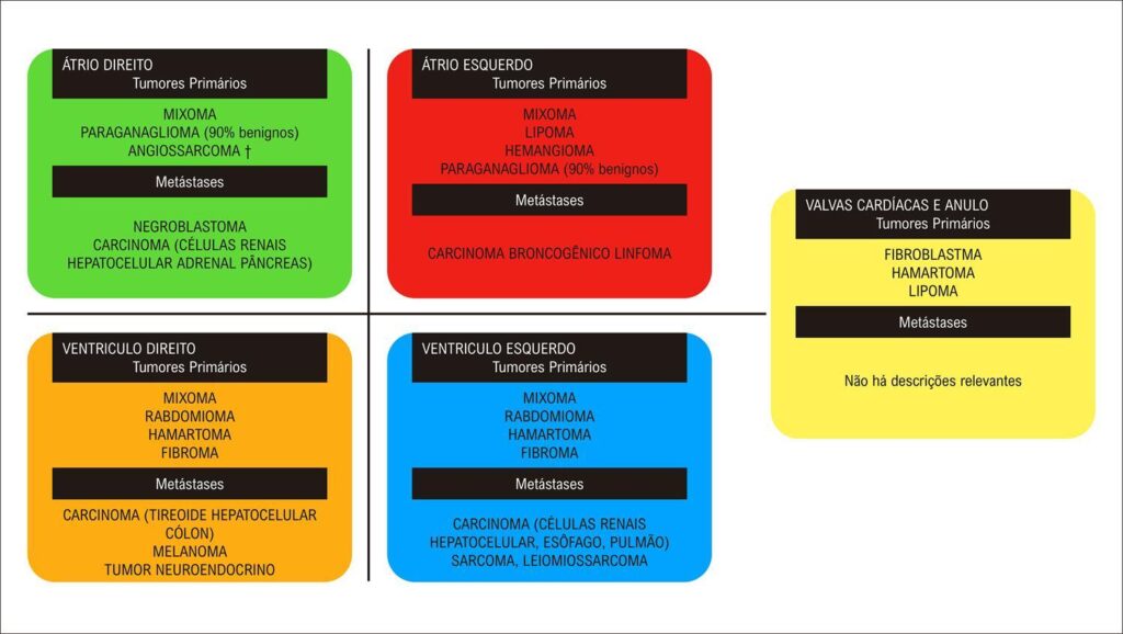 Tumores cardíacos são entidades clínicas consideradas raras e podem acometer qualquer tecido cardíaco. Os tumores cardíacos metastáticos (secundários) são mais frequentemente diagnosticados que os tumores primários (malignos ou benignos). Ambos podem causar obstruções valvares e/ou das vias de entrada e saída de quaisquer câmaras cardíacas, causando sintomas de insuficiência cardíaca, além de embolizações e arritmias. O tratamento dos tumores benignos geralmente é cirúrgico, e o dos tumores metastáticos e malignos primários dependerá da origem e do tipo, com prognóstico reservado. A recorrência dos tumores benignos é frequente. O objetivo deste artigo é proporcionar ao clínico ferramentas para otimizar o diagnóstico, diagnóstico diferencial e tratamento de tumores com características obstrutivas, causadores de insuficiência cardíaca.